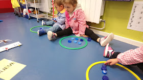 Consigna: "Sacamos una mano, saludamos, hooooolaaaaaaa! bajamos la mano, cogemos un tapón de dentro del aro y lo ponemos fuera del aro. Sacamos un dedo...y contamos los tapones que hay ahora, dentro del aro, anotamos y contamos los que tenemos fuera del aro, y anotamos".