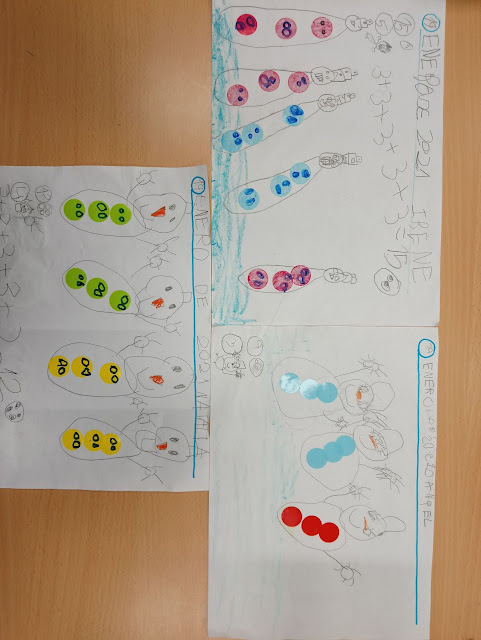 En el aula de 3 años de la compañera Ana Vela del CEIP Sisius de Seseña (Toledo), los botones de los muñecos se utilizan para desarrollar situaciones de Cambio 1 (CA1). "El muñeco de nieve tiene dos botones, si le ponemos dos botones más ¿Cuántos botones tiene ahora?"