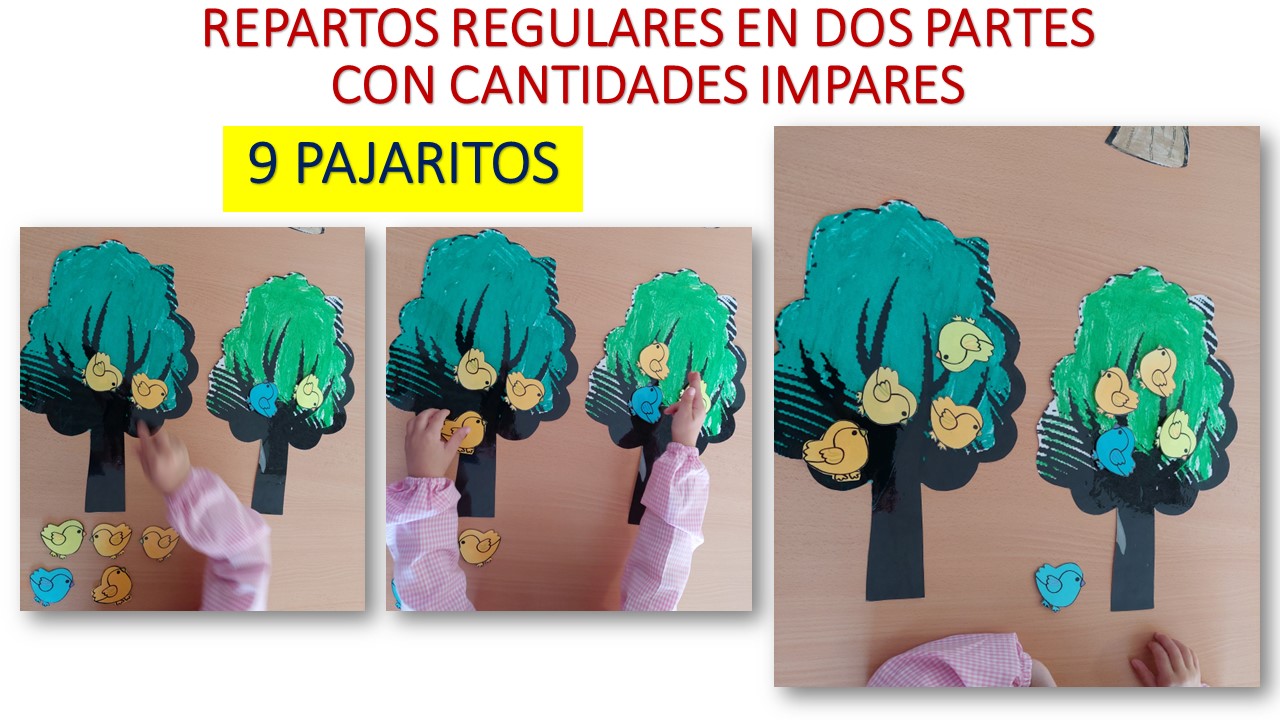 REPARTOS REGULARES EN DOS PARTES sin y con resto con los árboles del bosque y los grumpis elaborados y pajaritos.